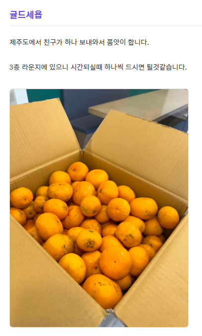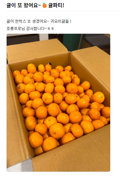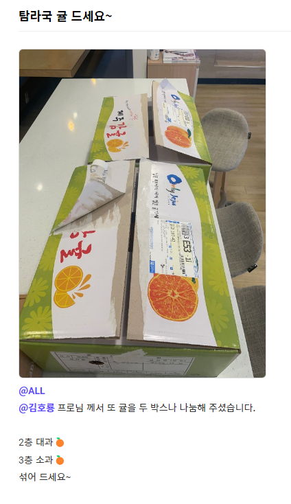 파견지에 계신 분들도 서운하시지 않도록 🍊귤🍊을 한 박스씩 받을 수 있었어요.